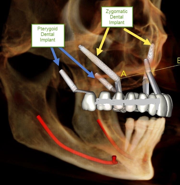 Implant placement through the maxillary tuberosity and in the pterygoid plate. Treatment approach can be utilized in patients with serious maxillary decay or following tumor resection.